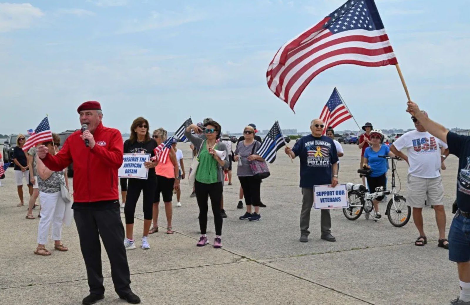 More than 100 city residents and several officials recently staged a protest near Brooklyn’s Floyd Bennett Field, demanding that local authorities shut down a migrant tent city on federally owned land. Frustrated locals, many waving American flags, gathered in a large demonstration. A caravan of over 90 vehicles arrived with banners displaying messages like “Save the American Dream” and “Stop Migrant Crime.” Others called for an end to the city’s lease agreement that allowed the site to be used as a shelter for 2,000 people—a facility that has been a source of complaints from neighboring residents since its opening in 2023.